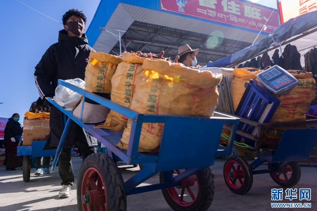 圖為物交會(huì)上,商戶在運(yùn)送牦牛肉干(12月2日攝)。新華網(wǎng)發(fā) 李騰 攝