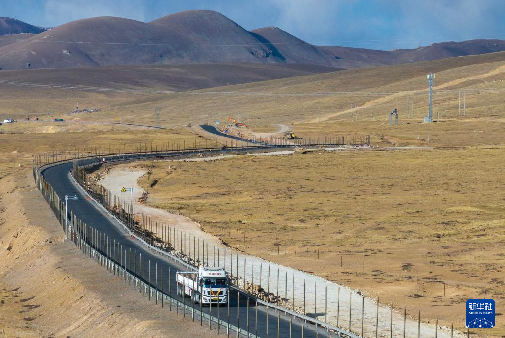 這是靠近唐古拉山口的一段青藏公路,路兩邊密布熱棒(無人機照片,11月30日攝)。 新華社記者 姜帆 攝