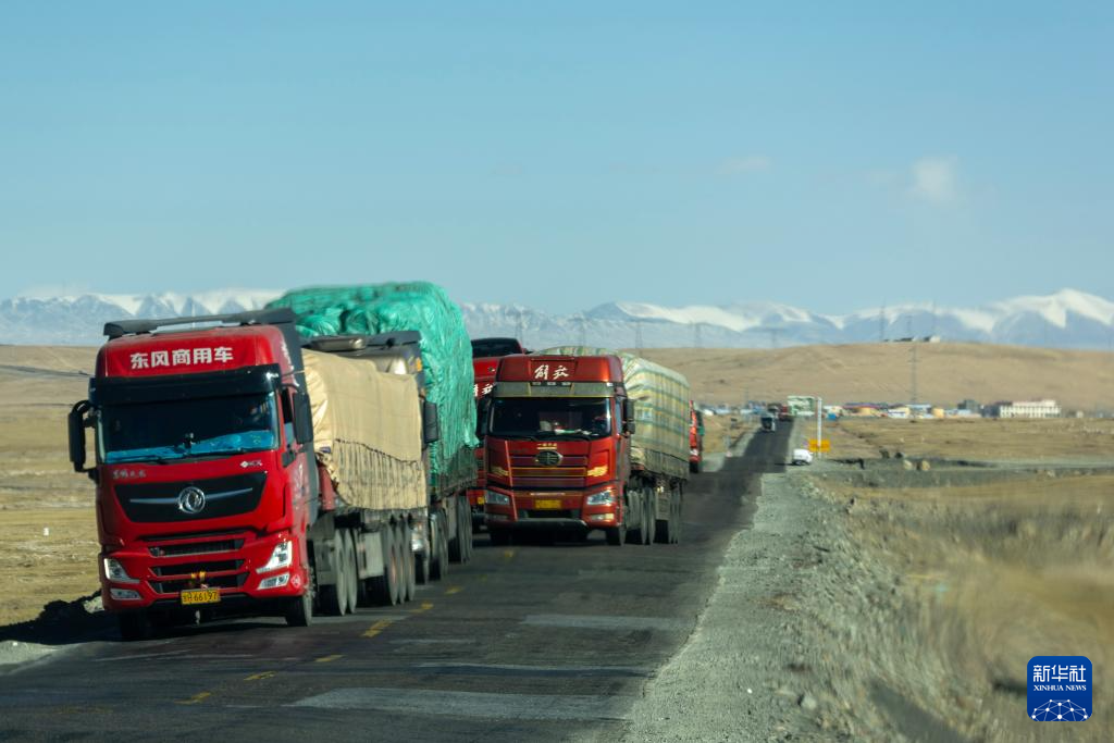 貨車從兩側遍布熱棒的青藏公路一段經(jīng)過(12月2日攝)。新華社記者 姜帆 攝