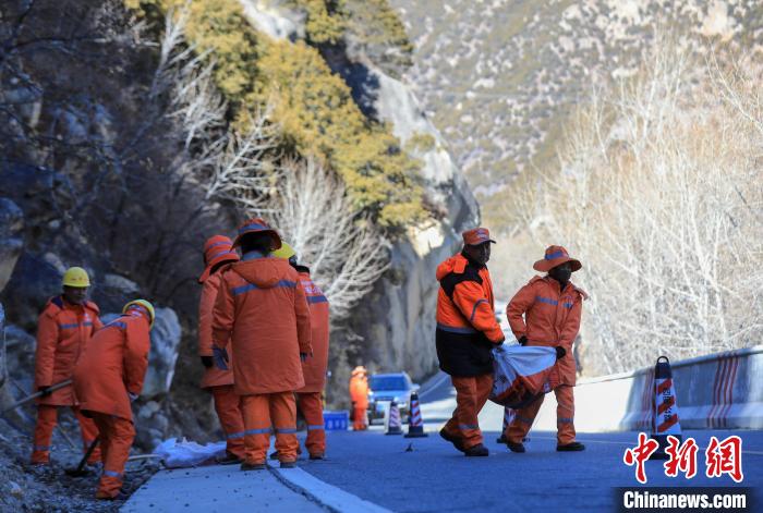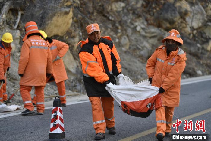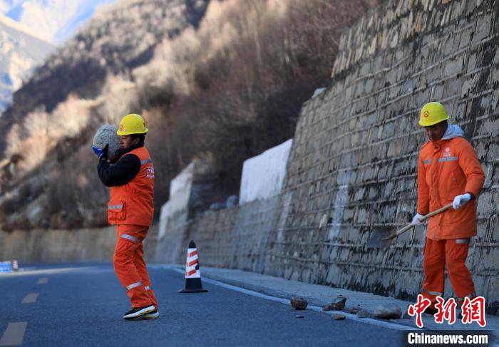 12月16日,西藏自治區(qū)林芝公路事業(yè)發(fā)展和應(yīng)急保障中心(工布江達(dá)養(yǎng)護(hù)段)道路養(yǎng)護(hù)工人及時清除川藏公路上的落石,保障道路暢通。該養(yǎng)護(hù)段擔(dān)負(fù)著川藏公路沿線工布江達(dá)縣路段的養(yǎng)護(hù)管理、應(yīng)急搶險等工作,包括路面修補(bǔ)、清理邊溝、維護(hù)交通安全設(shè)施等日常養(yǎng)護(hù)工作。圖為養(yǎng)護(hù)工人清理公路上的落石。中新社記者 王磊 攝