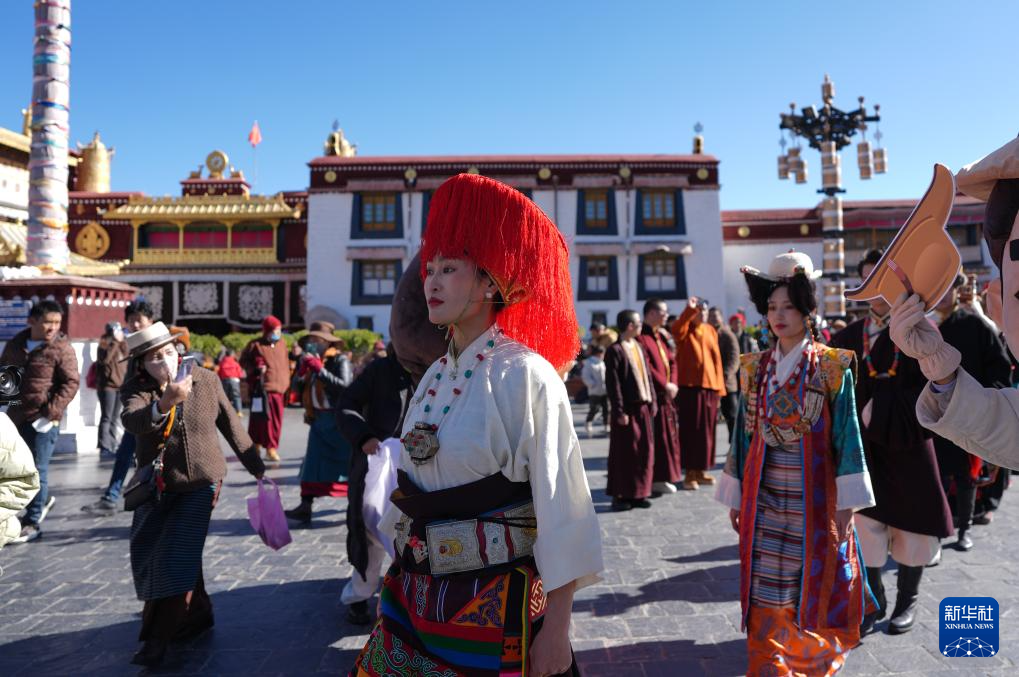 作為拉薩市文化和旅游局主辦的“繁飾自然·衣彩拉薩——拉薩新年服飾秀”群眾文化活動的一部分,1月3日,穿著傳統(tǒng)藏裝的模特巡游在拉薩八廓街。