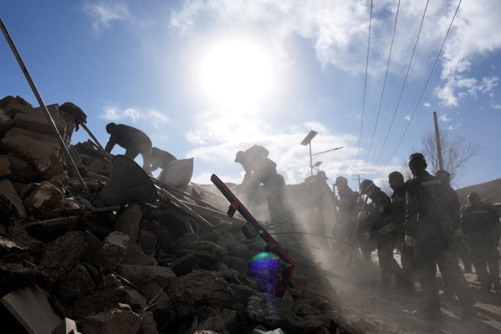 1月7日,救援人員在定日縣長所鄉(xiāng)古榮村進行搜救。
