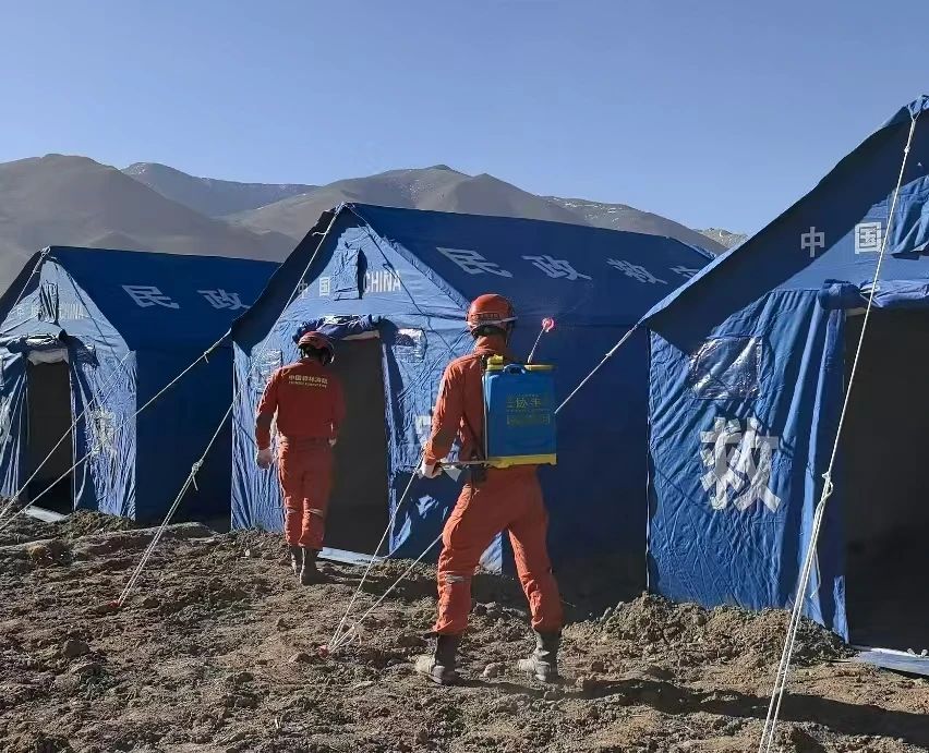 圖為巴宜區(qū)中隊團員青年突擊隊在地震災(zāi)區(qū)進行消殺作業(yè)