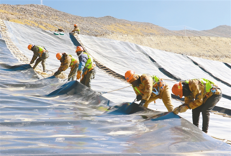 中鐵十七局集團(tuán)第二工程有限公司西藏巨龍德慶普項(xiàng)目現(xiàn)場工人正在拉薩市達(dá)孜區(qū)海拔5000米以上的施工區(qū)域進(jìn)行鋪膜防滲作業(yè)。