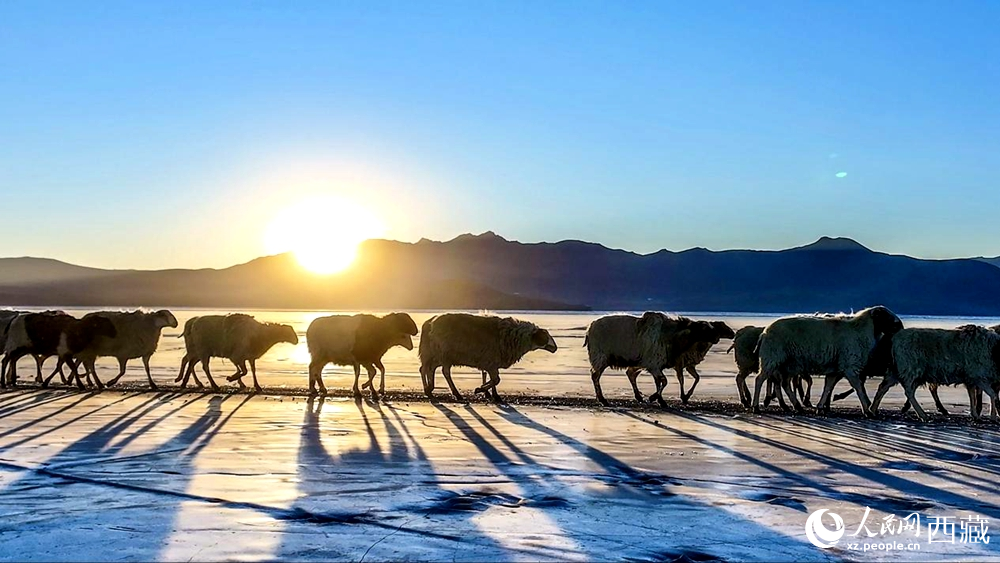 隨著一聲號令,牧民們驅(qū)趕著羊群,踏上冰封的湖面。遠(yuǎn)遠(yuǎn)望去,羊群如同一串串黑白相間的珍珠,在湛藍(lán)的冰面上緩緩移動,構(gòu)成一幅壯美的高原畫卷。