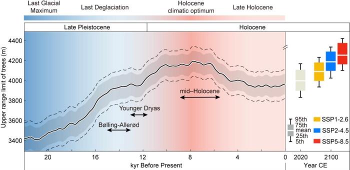研究結(jié)果顯示,青藏高原平均樹線海拔在末次冰期最低(約3426米);全新世大暖期(距今約8000年)達到最高(約4187米),比當(dāng)前的平均樹線(約4009米)高約180米。冰期與間冰期樹線波動幅度高達850米,導(dǎo)致間冰期高山特有物種棲息地面積僅為冰盛期的約50%。
