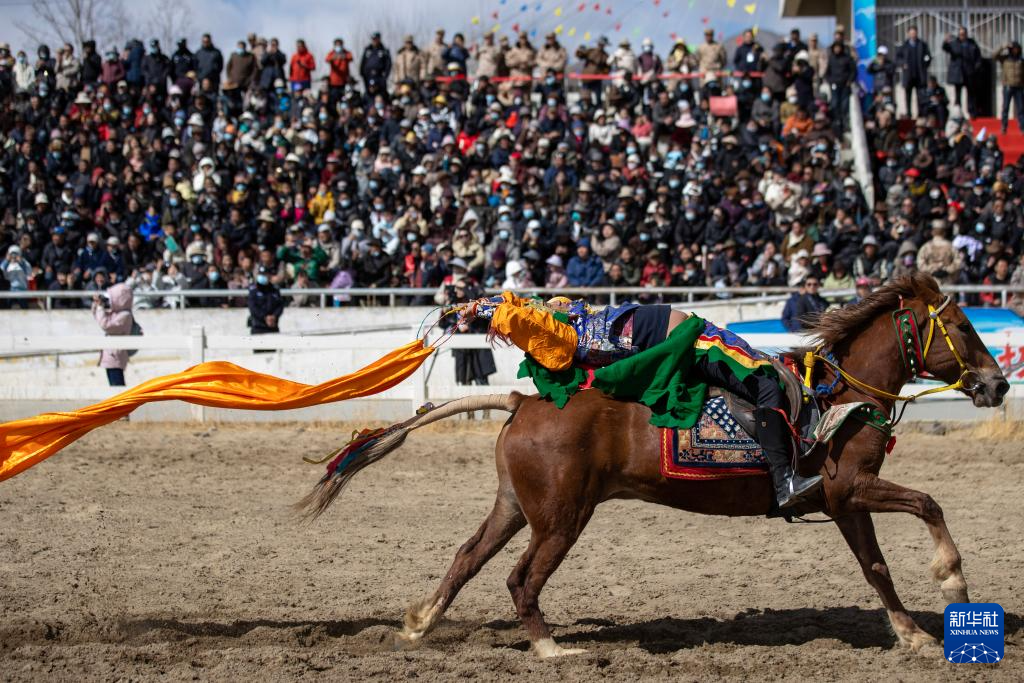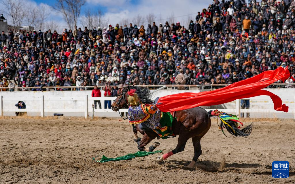 3月2日,馬術(shù)隊(duì)員在表演傳統(tǒng)馬術(shù)項(xiàng)目撿哈達(dá)。新華社記者 晉美多吉 攝