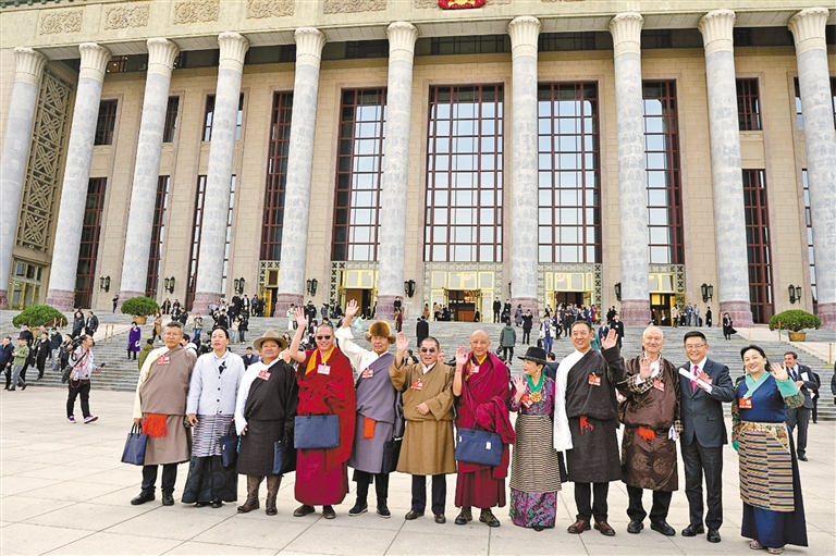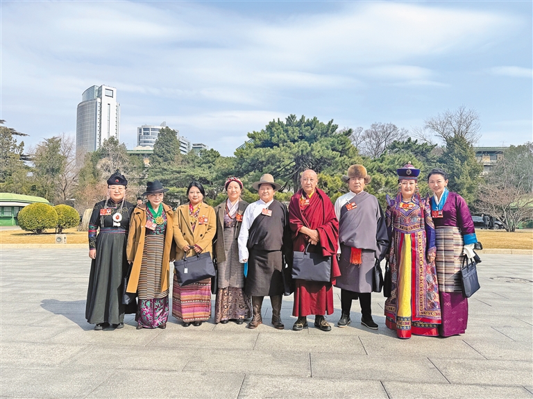 圖為住藏全國政協(xié)委員身著盛裝、滿懷豪情,在人民大會(huì)堂前合影留念。記者 丹增平措 攝