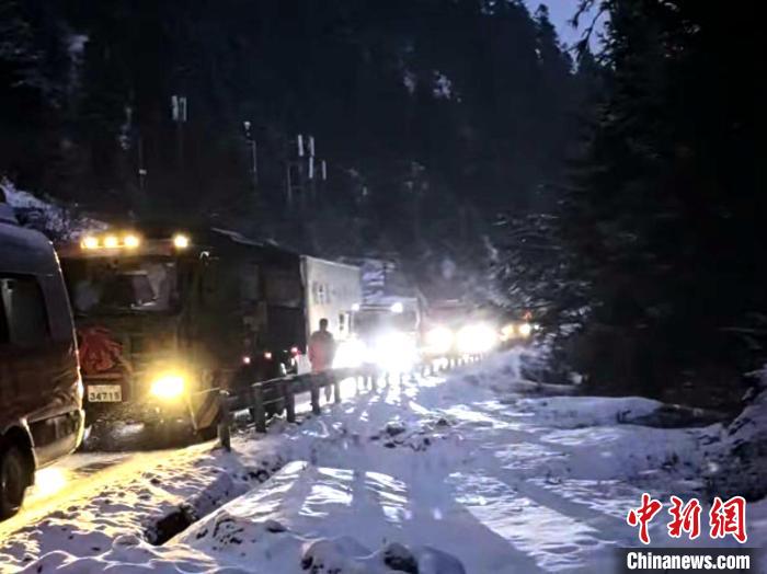 當夜幕降臨之時,大風(fēng)夾著雪粒呼嘯不止,山上的氣溫也越來越低,部分司乘人員出現(xiàn)焦慮,官兵們一邊耐心地安撫司乘人員焦急的情緒,一邊有條不紊地指揮車輛緩緩挪動。
