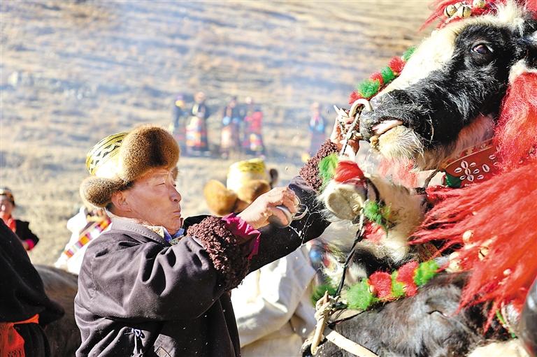 山南市瓊結(jié)縣拉玉鄉(xiāng)村民給耕牛喂青稞酒。通訊員 米瑪央金 倫珠澤仁 攝