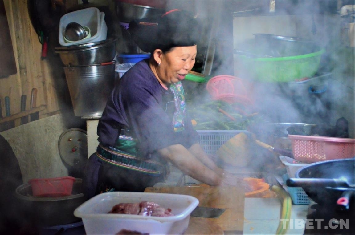 中國西藏網(wǎng)訊 上午十點多,差不多到了楊珍壽一天之中最忙碌的時候。她有條不紊地翻炒著大鐵鍋里的雞肉,母親在她身后切著菜,父親在劈著柴火。再過一個小時左右,自家的農(nóng)家樂就要開飯了。每到周末,更多游客會來到這里,忙碌翻倍,收入也會翻倍。