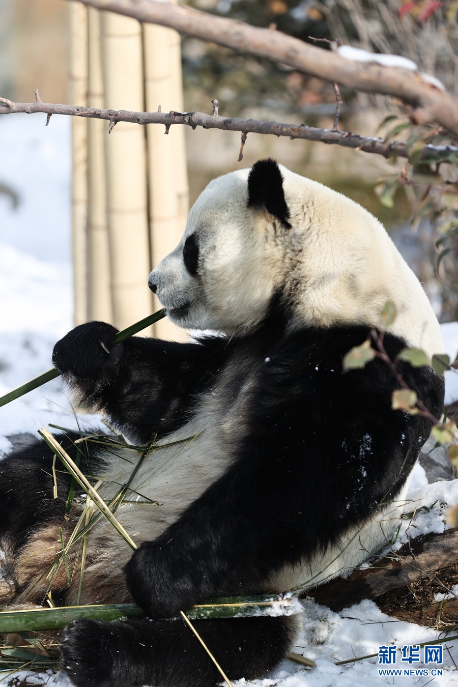 近日,受冷空氣影響,青海省西寧市迎來降雪。西寧熊貓館的四只大熊貓?jiān)谘┨炖锵硎苤灾褡印ⅰ按蝽飪骸钡臉啡ぁ?/p>