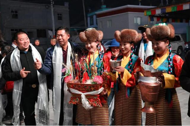 首發(fā)團一到達歡迎儀式現(xiàn)場,藏族同胞便端出裝滿糌粑、寓意圓滿如意的切瑪盒迎接游客,大家一起為游客獻上潔白的哈達,并送上真摯的祝?!霸鞯吕铡薄T餮┌筒貞蛱饋?,青稞酒喝起來,山南人民的熱情好客讓現(xiàn)場所有游客驚喜連連,感受到了滿滿儀式感。