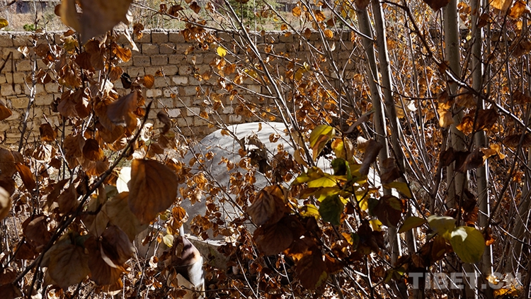 小土坡的東側(cè),土墻圍起一個方形區(qū)域,眼睛穿過黃葉,被樹木圈起的圓堡形墳冢,安葬的是旺青多杰的父親——龔海青。