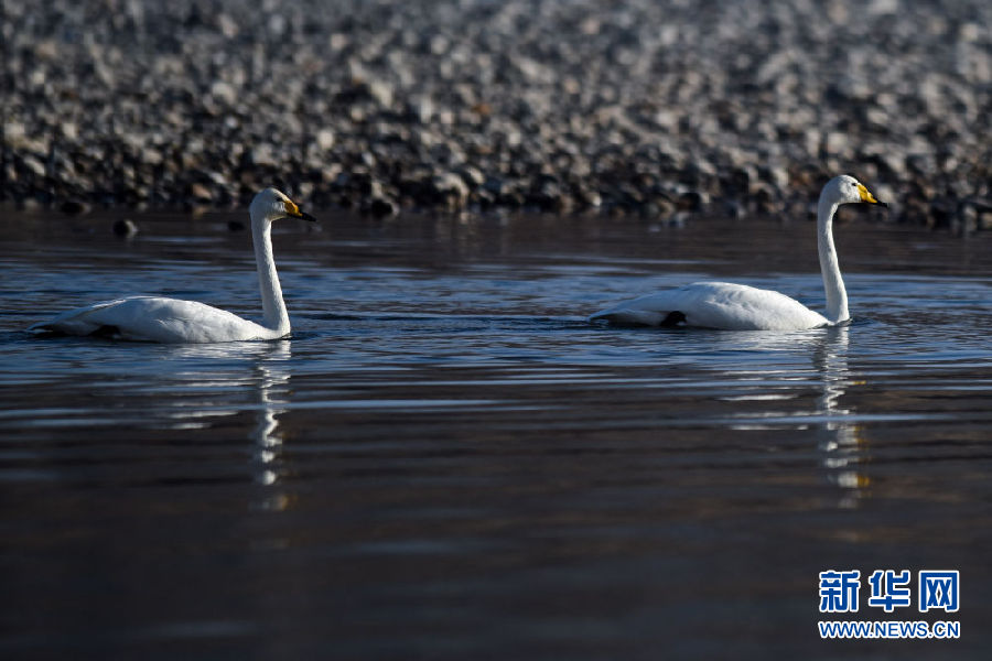 12月11日,兩只大天鵝在青海省貴德縣境內(nèi)的黃河里游弋。新華社記者 吳剛 攝