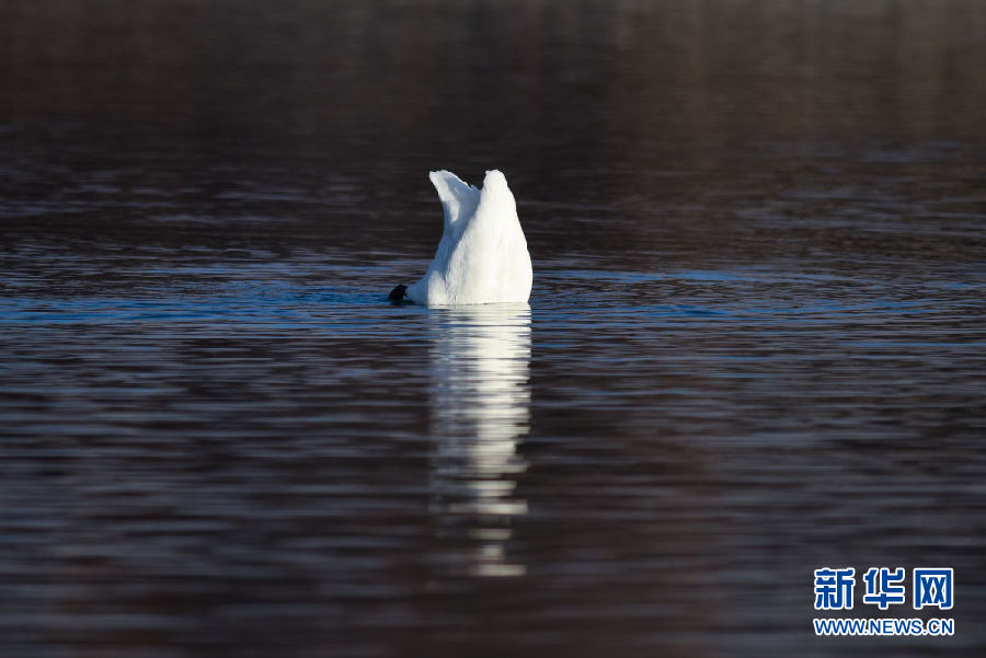 12月11日,一只大天鵝在青海省貴德縣境內(nèi)的黃河里覓食。新華社記者 吳剛 攝