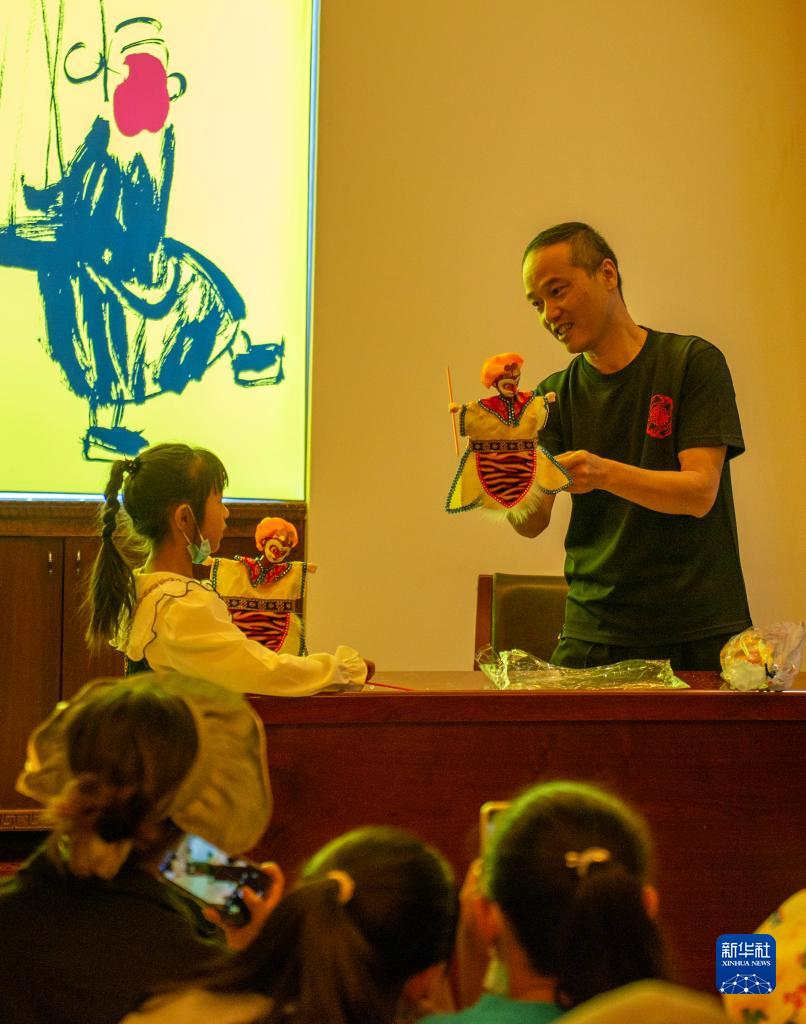 7月29日,泉州市提線木偶戲傳承保護(hù)中心國家一級(jí)演員沈蘇革(右)在展覽上為拉薩小學(xué)生講解木偶戲。新華社記者 劉洲鵬 攝