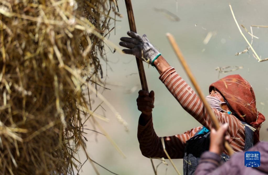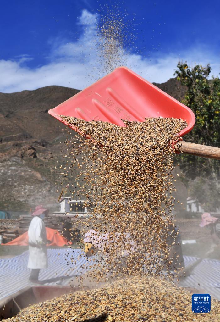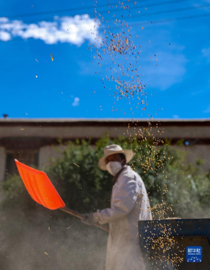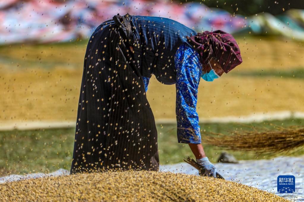 9月21日,拉薩市林周縣江熱夏鄉(xiāng)江夏村的村民在揚(yáng)場(chǎng)。新華社記者 覺果 攝