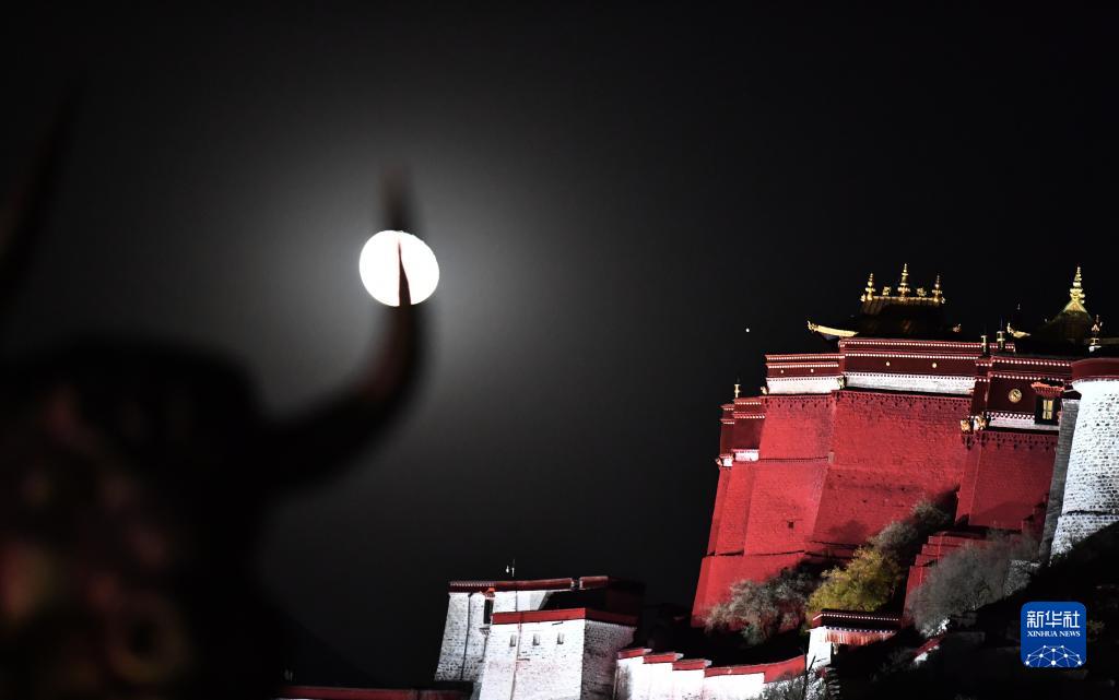 11月11日晚,一次賞心悅目的火星合月亮相天宇。這是在西藏拉薩市布達拉宮附近,記錄下的這幕“星月童話”。新華社記者 覺果 攝