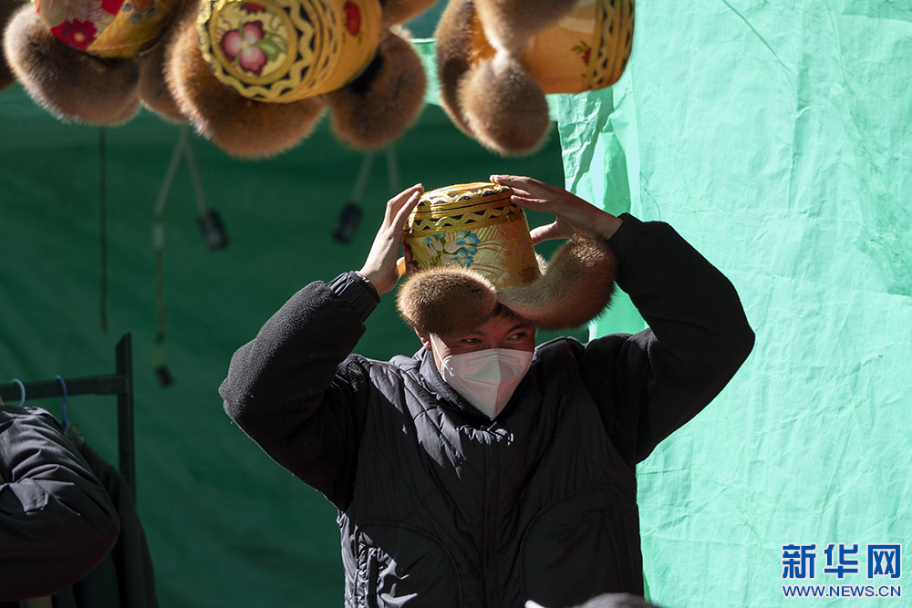 12月3日,顧客在物交會(huì)上試戴傳統(tǒng)金絲藏帽。新華網(wǎng) 旦增努布 攝
