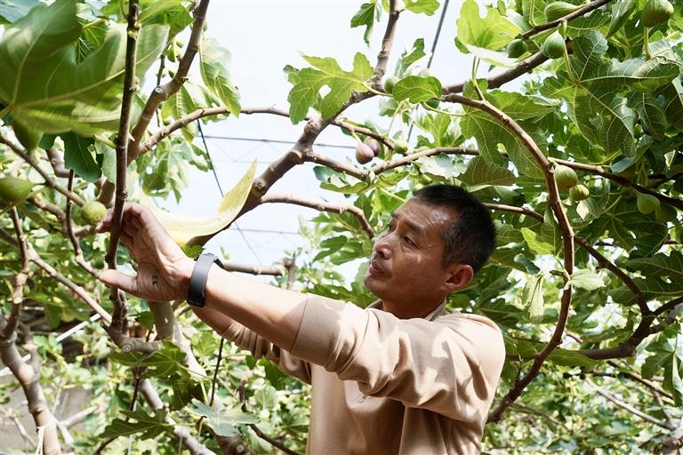張廣濤正在示范無花果采摘技巧。
