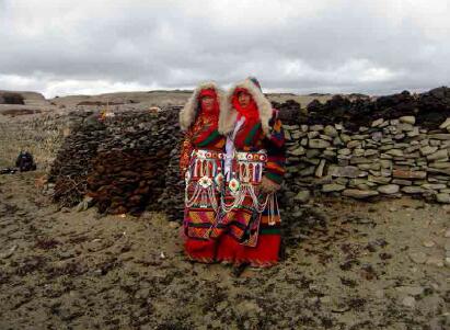 瑪旁布姆卡是西女國女王居住的城堡,普蘭縣文化局局長加措根據(jù)藏文大字典和《阿里史地探秘》的“瑪旁布莫卡”,解釋出“布”的漢文詞義,就是女人、女性、女子或者女王?!澳本褪窍悴莼蛘呦悴荼椴即松?。據(jù)當(dāng)?shù)匕傩战榻B,城堡遺址坐落在普蘭神湖瑪旁雍措湖的東部扎藏布溫泉溝南側(cè)的野嶺上,海拔5000米上下。在遺址上部高處還有一個碩大蘑菇形狀的巖石巋然迎風(fēng)屹立城堡上方,與下方城堡遺址交相輝映。這即是“出俞石、朱砂、麝香、牦牛、駿馬、蜀馬,尤多鹽,恒將鹽向天竺興販,其利數(shù)倍”西女王國的王城。在城堡上方更高處的山后,遺留有眾多的洞穴,說明女國的百姓就居住在女王的周圍。此外在山坡的下方扎藏布溝處,當(dāng)?shù)匕傩辗Q這塊地方為“卡爾青”,意思是大城堡之地。盡管史書上的記載十分有限,瑪旁布姆卡的故事仍然世世代代流傳在當(dāng)?shù)匕傩盏男闹??;魻柎逡晃荒赀~的老百姓告訴筆者,溫泉溝和曲古寺廟附近就有許許多多女王的傳說,聽說女王曾經(jīng)在此沐浴,但不知具體在什么地方。